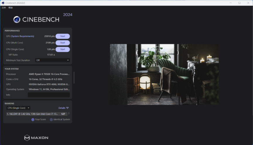 CineBench 2024基準測試,單核得分120pts,多核得分2109pts;