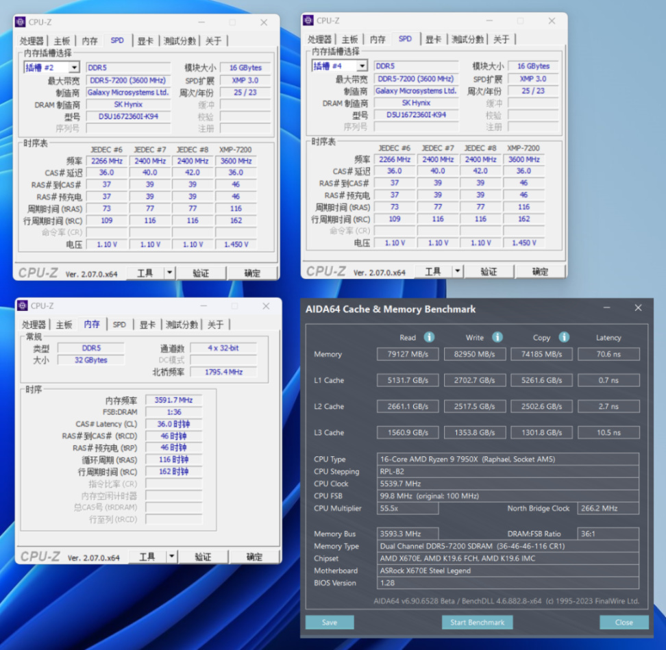 內存讀寫測試,直接開啓XMP,內存讀取速度爲79127 MB/s,寫入速度爲82950 MB/s,複製速度爲74185 MB/s,延時爲70.6 ns;
