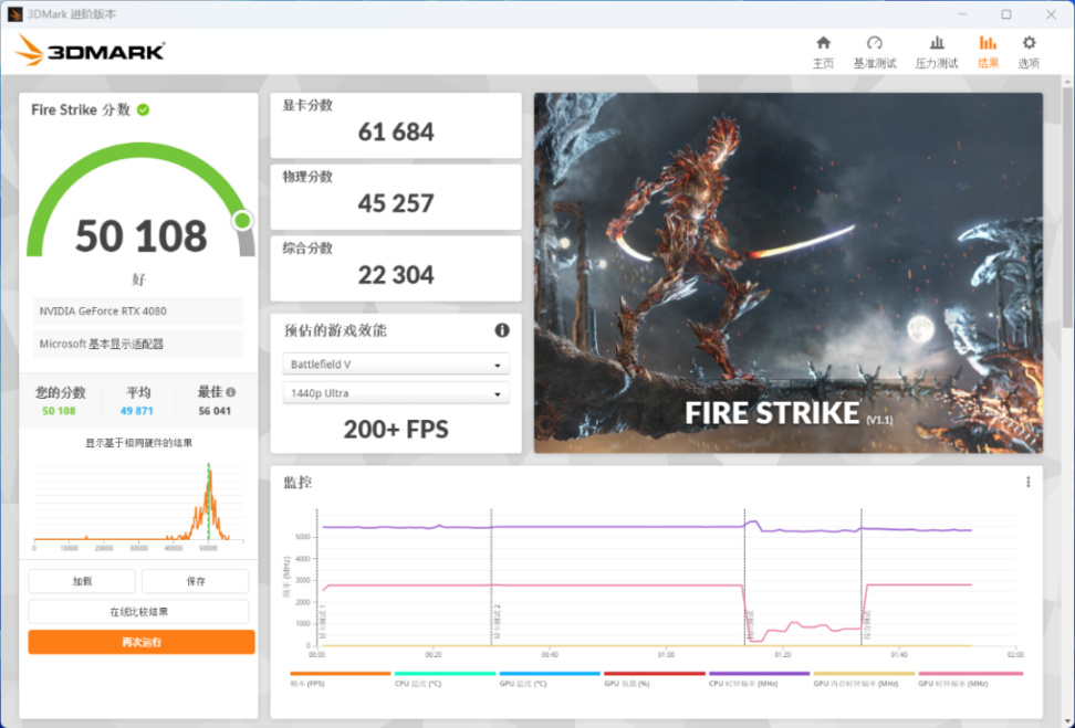 Fire Strike基準測試,顯卡得分61684分,物理得分45257分;
