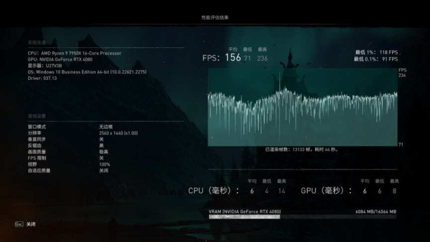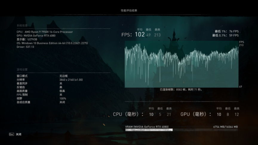《刺客信條·英靈殿》基準測試,極高畫質,4K分辨率下,遊戲平均幀率102FPS。2K分辨率下,遊戲平均幀率156FPS;