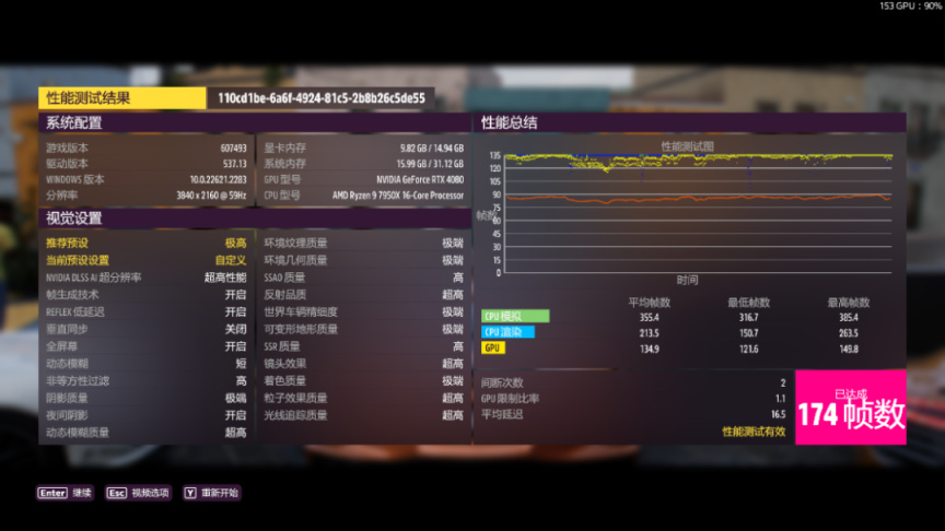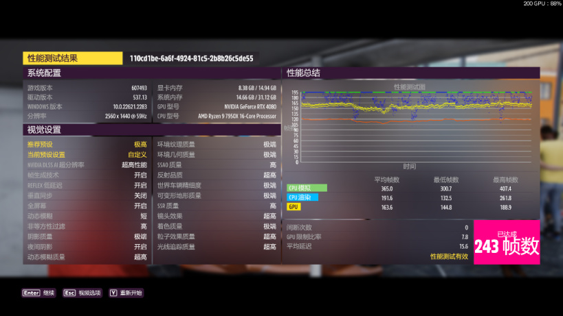 《極限競速·地平線5》基準測試,極端畫質,極端光追,DLSS超級性能,並開啓DLSS 3.0,4K分辨率下,遊戲平均幀率174FPS。2K分辨率下,遊戲平均幀率243FPS;