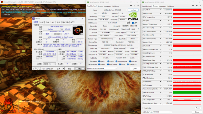 FurMark烤機測試,機箱內環境,烤機15Min,顯卡溫度66°左右,顯卡功耗310W左右;