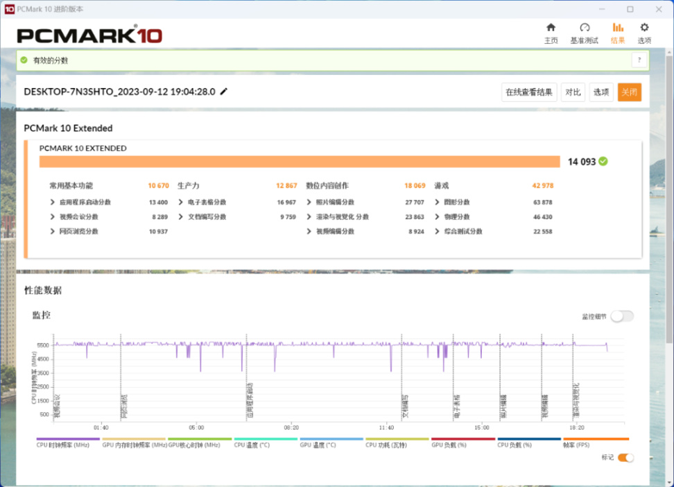 PC Mark Extended整機測試,整機得分14093分,常用基本功能得分10670分,生產力得分12867分,數爲內容創作得分18069分,遊戲得分42978分;