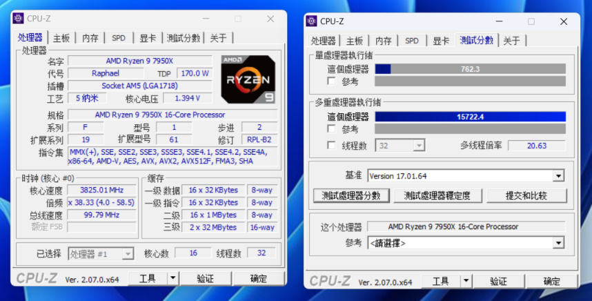 CPU-Z基準測試,單核得分762.3分,多核得分15722.4分;