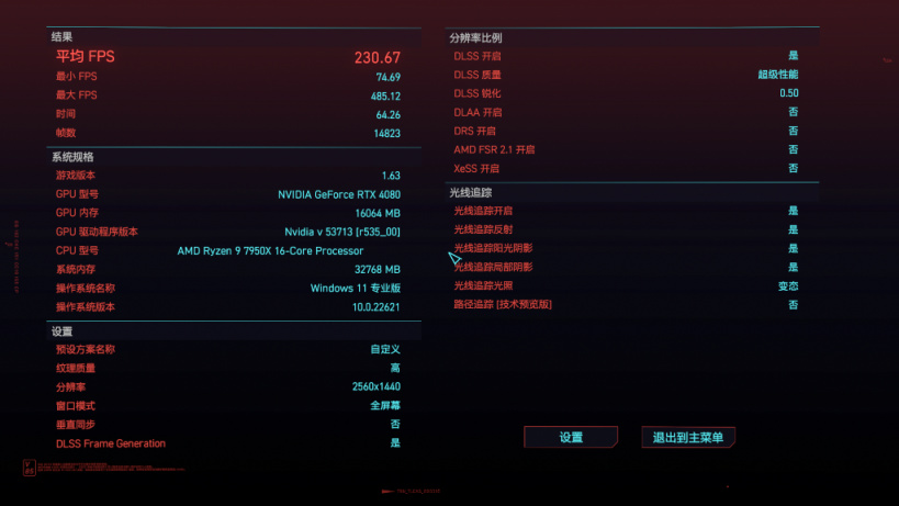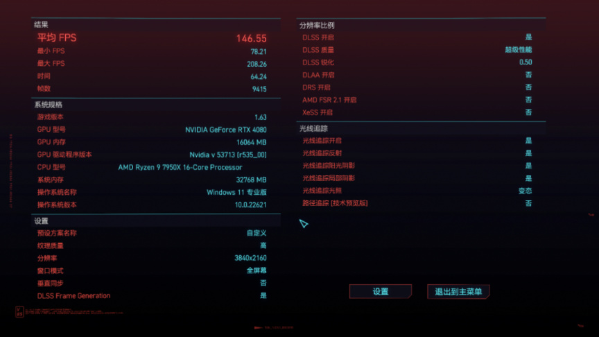 《賽博朋克2077》基準測試,畫質超級,光追超級,DLSS設爲超級性能模式,並開啓DLSS 3.0,4K分辨率下,遊戲平均幀率爲146.55 FPS。2K分辨率下,遊戲平均幀數230.67 FPS;