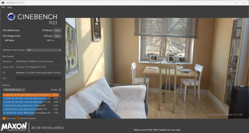 CineBench R23 基準測試,單核得分1974pts,多核得分37728pts;