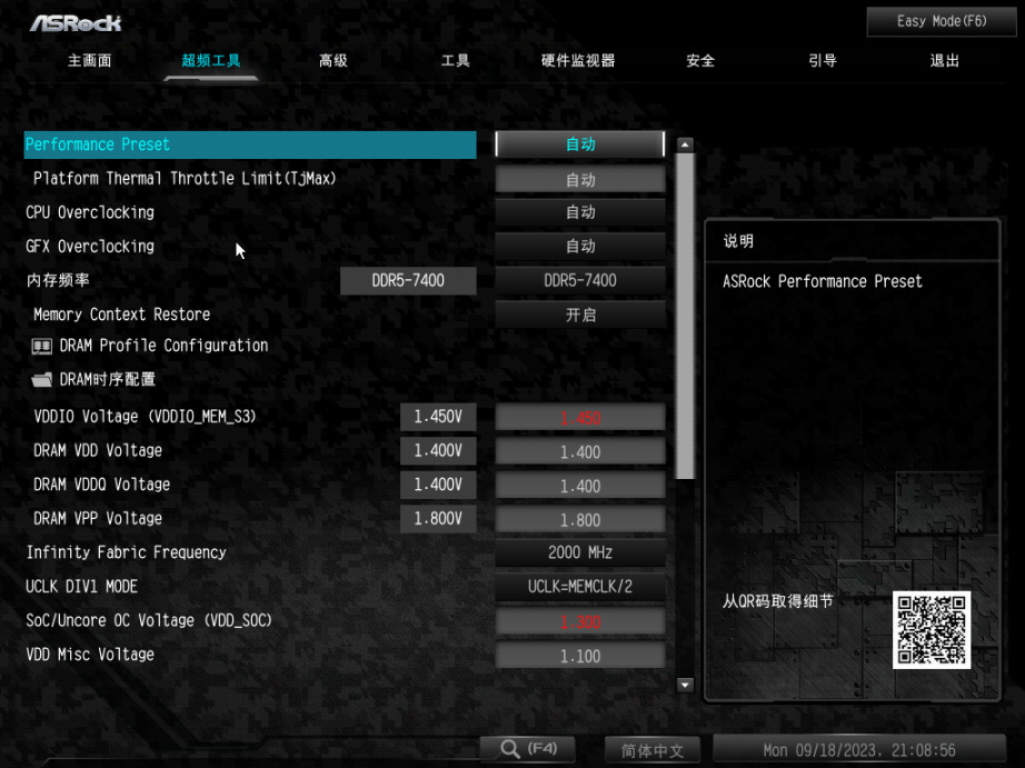 手動將內存頻率設爲DDR5-8000MHz,並內存電壓設爲了1.45v,內存VDD電壓、VDDQ電壓全部設爲1.4v,內存VPP電壓則爲1.8v,VDD_SOC電壓設爲1.3v