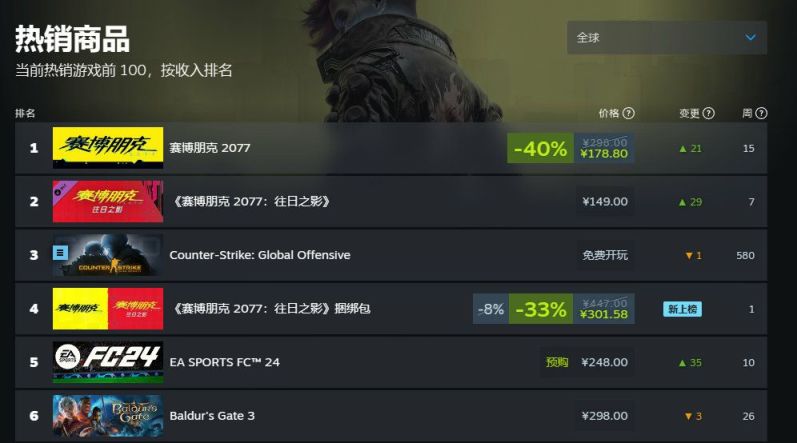 赛博朋克2077:往日之影正式发售,登顶 Steam 全球游戏热销榜,更新2.0版本后,《赛博朋克2077》在线人数激增,昨日巅峰在线人数突破16万