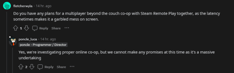 一名參與問答的用戶詢問除了之前與 Switch 版本一同推出的本地四人合作模式外,是否計劃推出其他多人遊戲模式。Poncle 的回應是積極的,表示他們正在研究真正的在線合作模式。不過,他們也強調目前無法做出承諾,因爲這是一項複雜的任務。