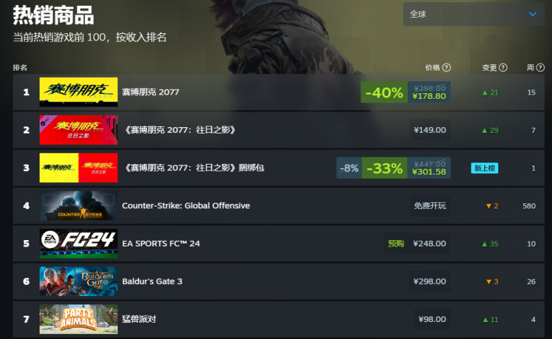 目前《賽博朋克 2077》已經霸榜 Steam 全球熱銷榜前三,其中游戲本體已經登頂 Steam 全球熱銷榜,而資料片“往日之影”則爲第二名,本體 + 資料片的捆綁包爲第三名。