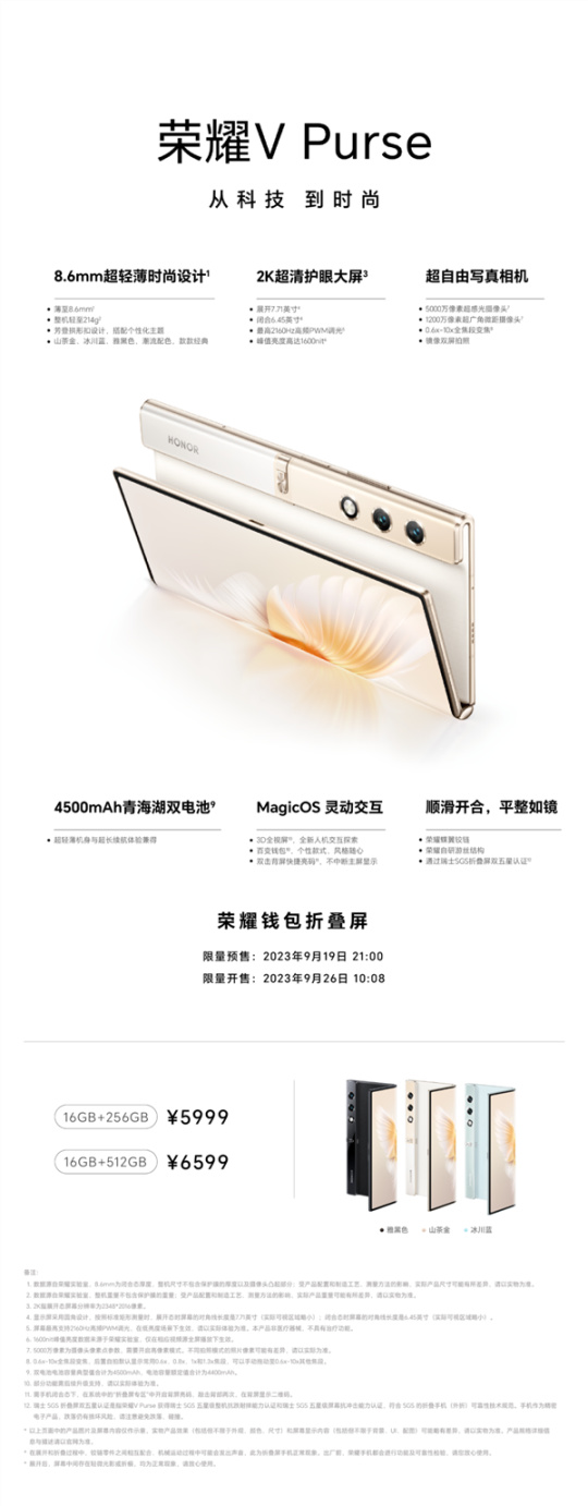 今天上午10:08,荣耀最新款的外折手机荣耀V Purse将正式开售。