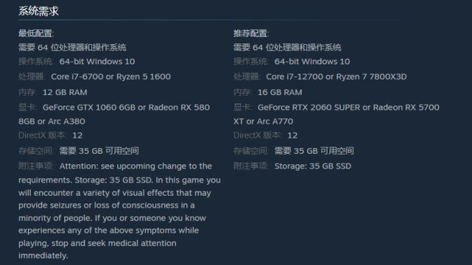 资料片的推荐配置为 Core i7-12700 或 Ryzen 7 7800X3D 处理器,GeForce RTX 2060 SUPER 或 Radeon RX 5700 XT 或 Arc A770 显卡,以及 16 GB 内存: