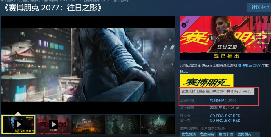 《赛博朋克 2077》资料片[往日之影] 现已正式上线,目前在 Steam 上的评价为“特别好评”,好评率 91%: