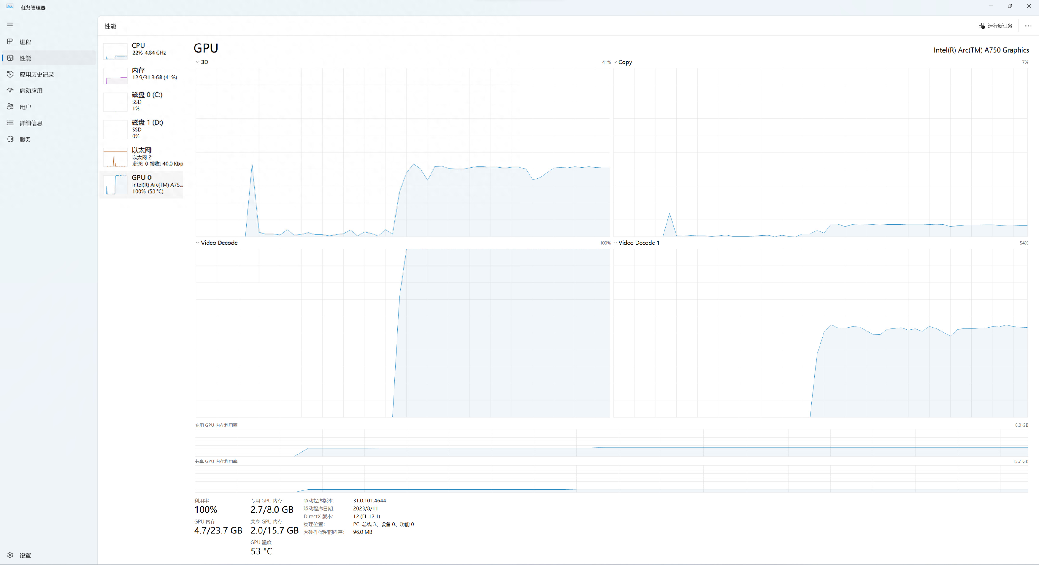 而且我们在使用AV1 格式导出的时候,可以看到 GPU 是火力全开的状态,占用率是100%,而且导出速度极其不错。