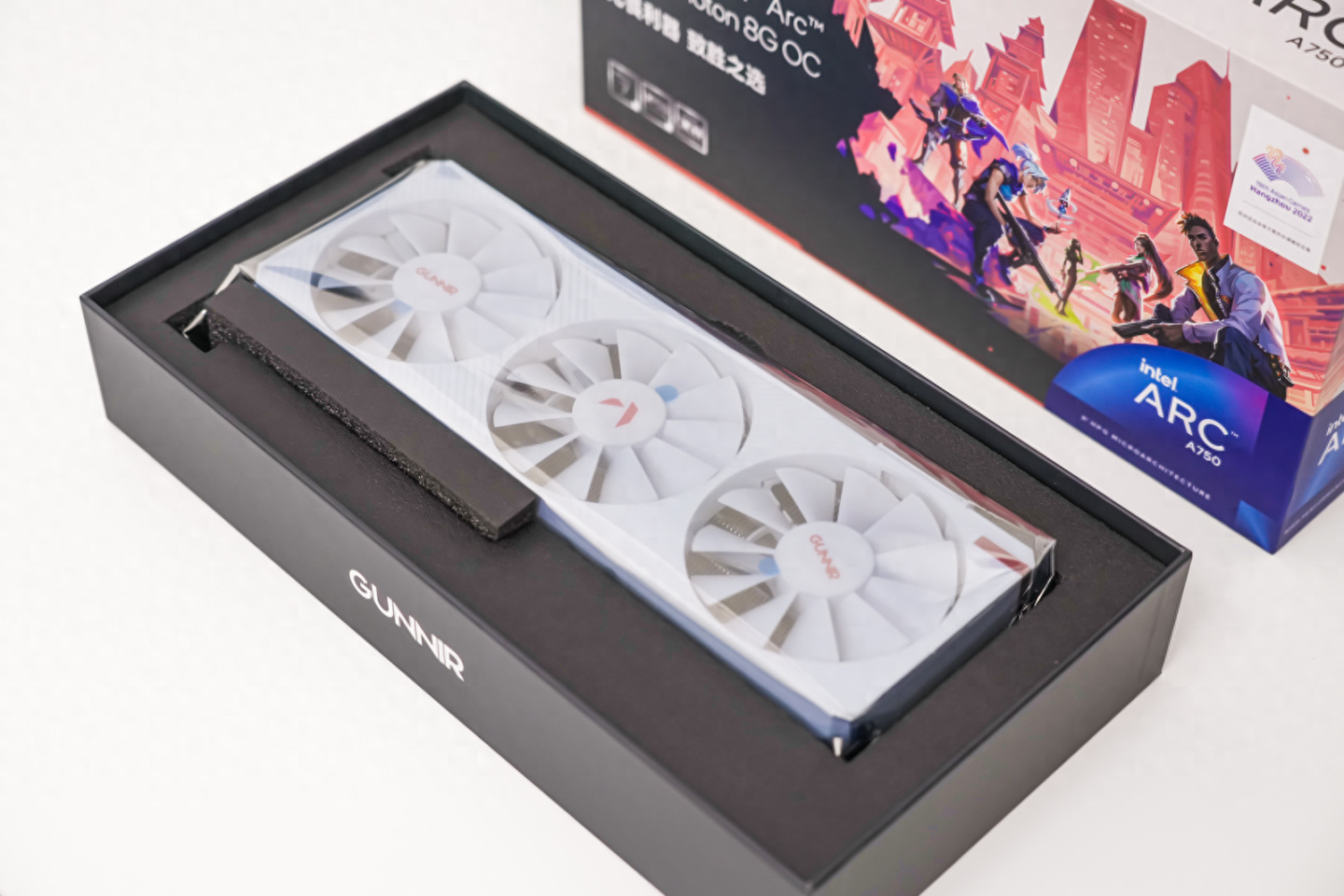蓝戟Intel ARC A750亚运特别版显卡采用靓丽的白色主题外观设计,非常适合搭配白色机箱平台使用。外盒设计上,左边是 Intel 的标示特色,右边是无畏契约的游戏人物,将联名这个概念渲染到位,整体黑红配色也比较符合电竞风格。三风扇散热设计,接近三插槽的厚度,使得这款显卡的体积比较大,尺寸也比较长,达到300mm,用户在安装时需要留意自己机箱的内部安装空间。