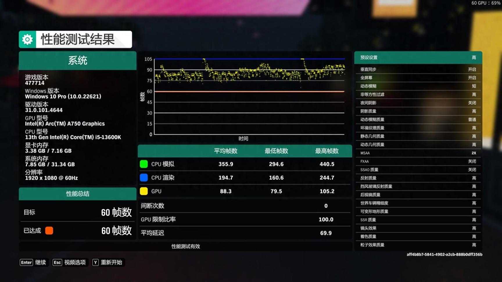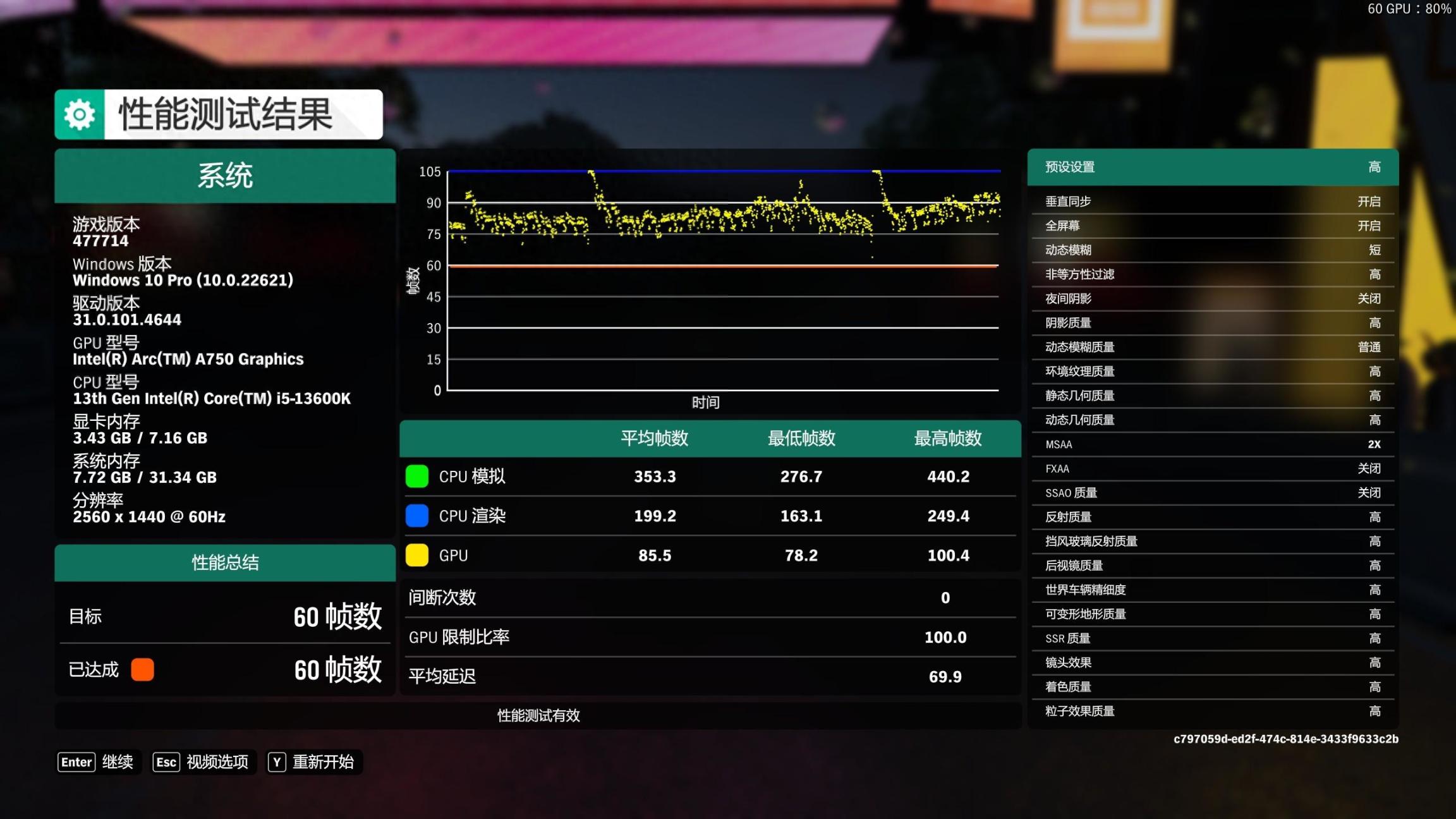 蓝戟A750在荒野大镖客中的表现十分不错,2K分辨率下高画质平均帧都来到了 60帧,1080P分辨率高画质来到了75帧率,这个表现已经能够畅玩了。