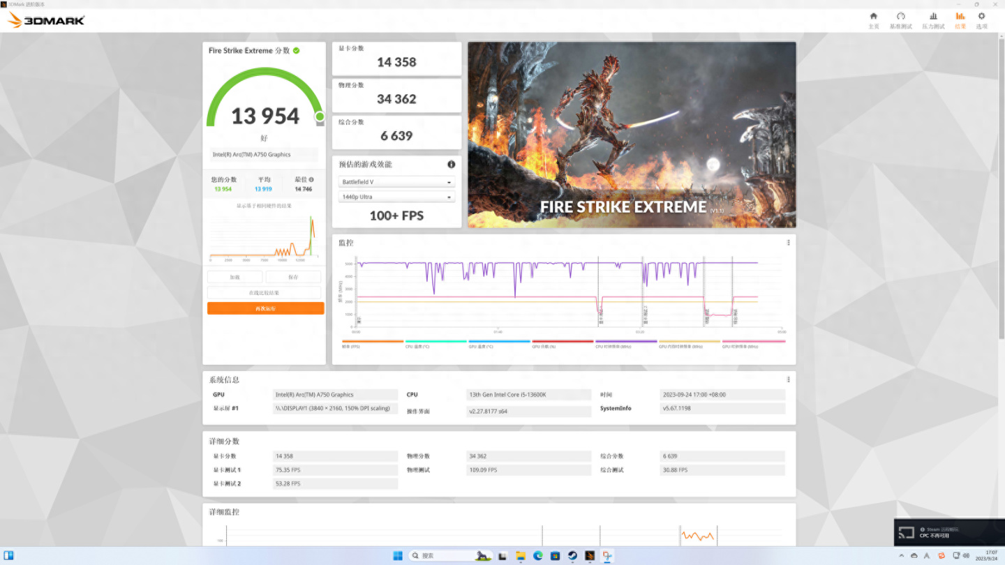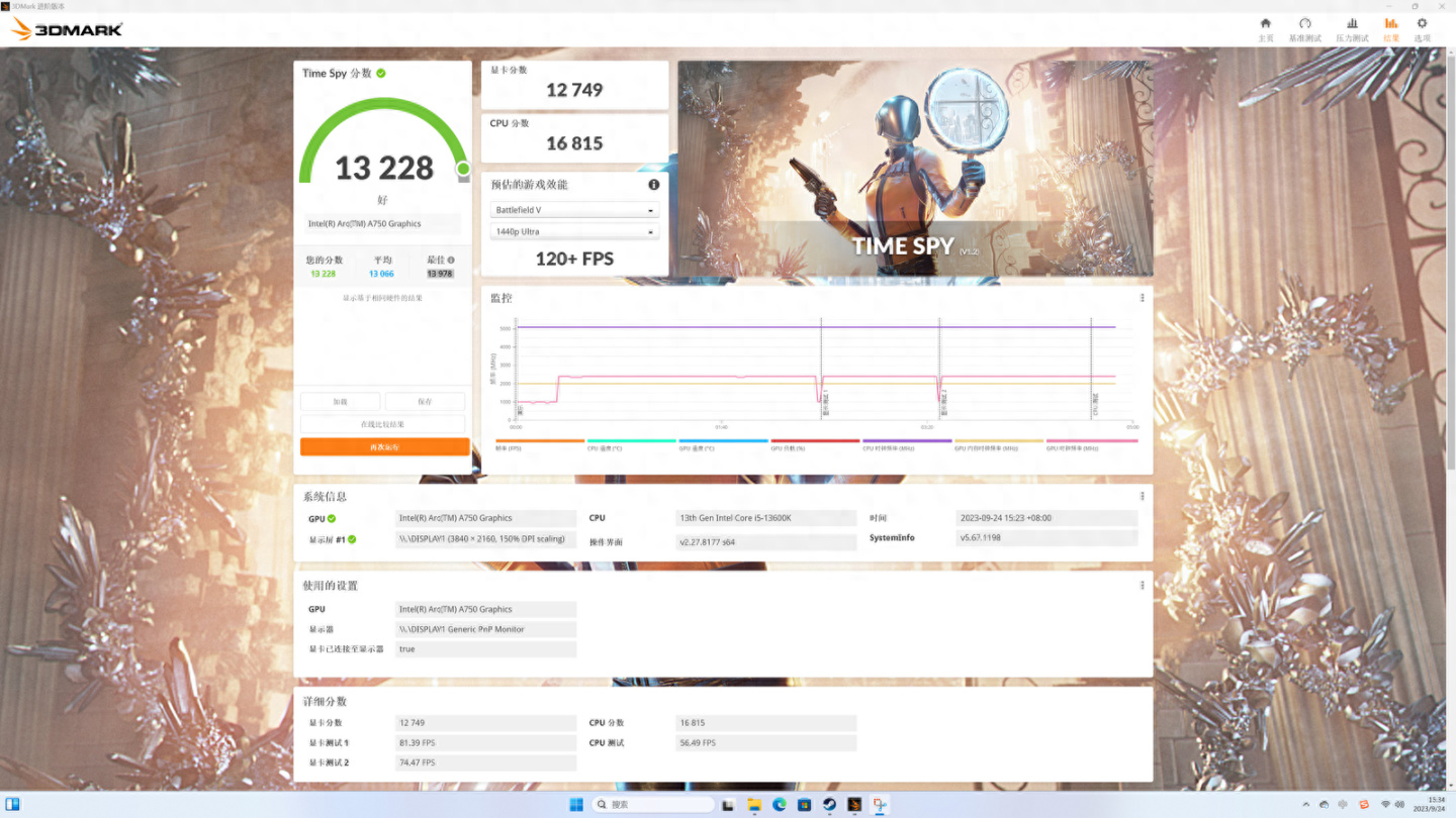首先是TimeSpy的跑分,显卡得分12749。Time Spy的基准测试包括两个图形测试和一个CPU测试,分别展示了DirectX 12在不同方面的优势。图形测试使用传统的前向渲染技术,模拟了一些常见的游戏场景。图形测试使用延迟渲染技术,展示了更复杂的光照和阴影效果。CPU测试则利用多线程和异步计算来模拟高负载的游戏物理和逻辑。TimeSpy的基准测试结果由图形分数、CPU分数和总分数组成,可以与其他用户进行比较。在战地5游戏里面预计可达到120+FPS的帧率。