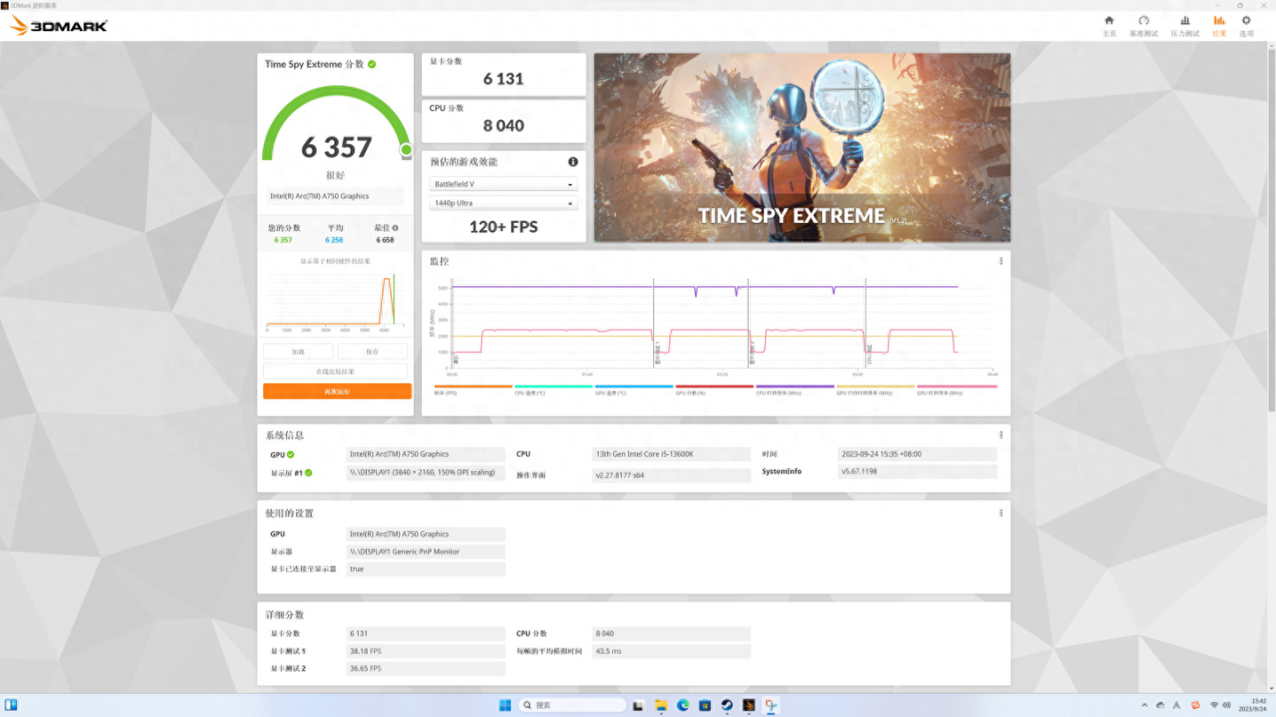 紧接着是TimeSPYExtreme跑分,Time Spy Extreme 作为进阶版,看重的是 4K分辨率下 DirectX 12 的游戏性能测试。实测下来,蓝戟 A750 无畏契约版的得分为6131。