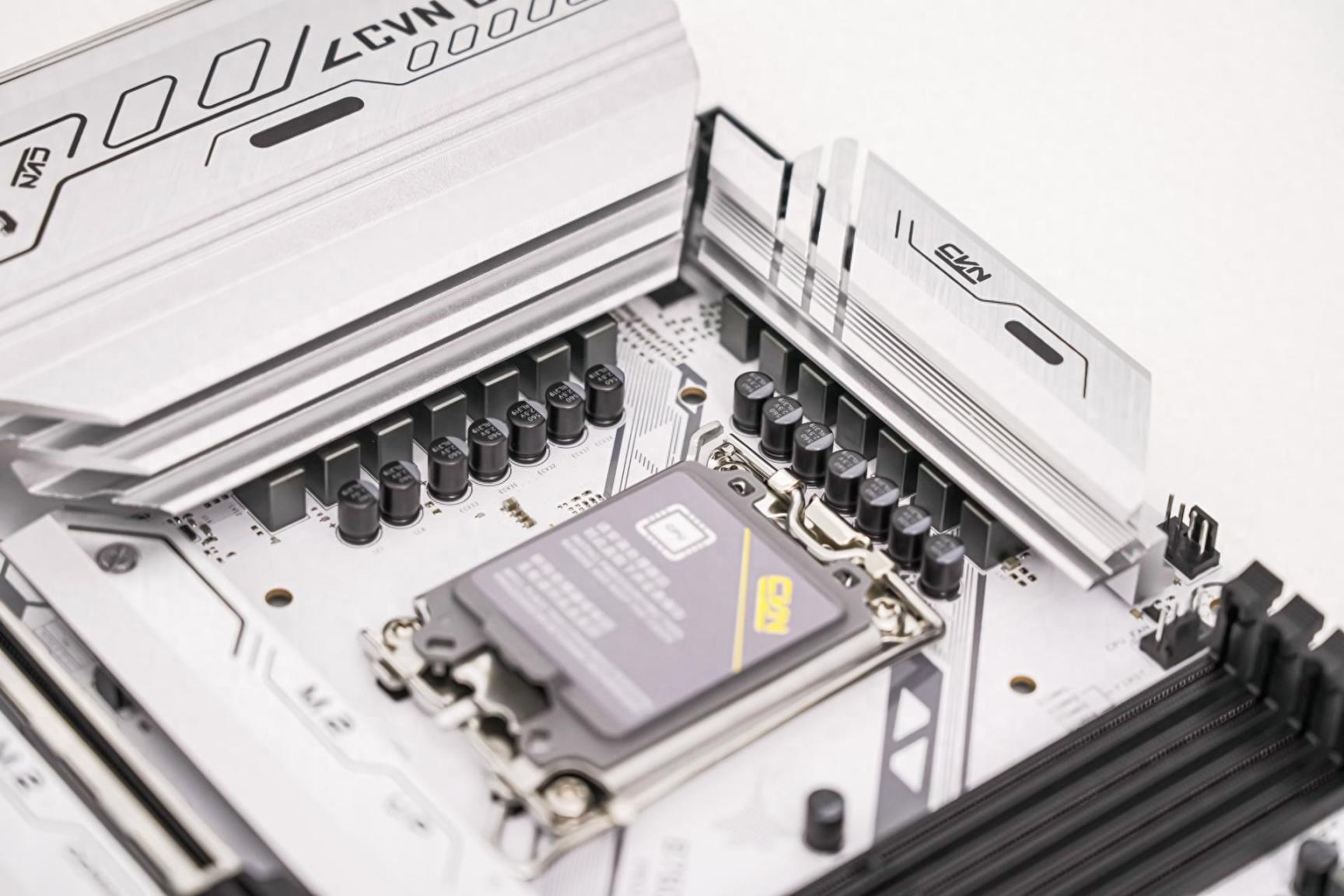 七彩虹CVN B760M战列舰采用的是M-ATX板型,满足中小型机箱的装机需求。可能会有玩家担心M-ATX板型主板在用料和扩展能力上有所缩水,对于七彩虹CVN B760M战列舰来说并不会有这一问题。供电部分,主板采用的是12+1相数字混合供电设计,搭配的是最大输出电流达到55A的三合一封装DrMos管、增强本身性能的同时降低电感线圈对其它元件干扰的F.C.C铁素体电感以及稳定滤波不爆浆的10K黑金固态电容,能够轻松应对第13代酷睿高端型号苛刻的供电需求,确保产品长时间运行稳定。