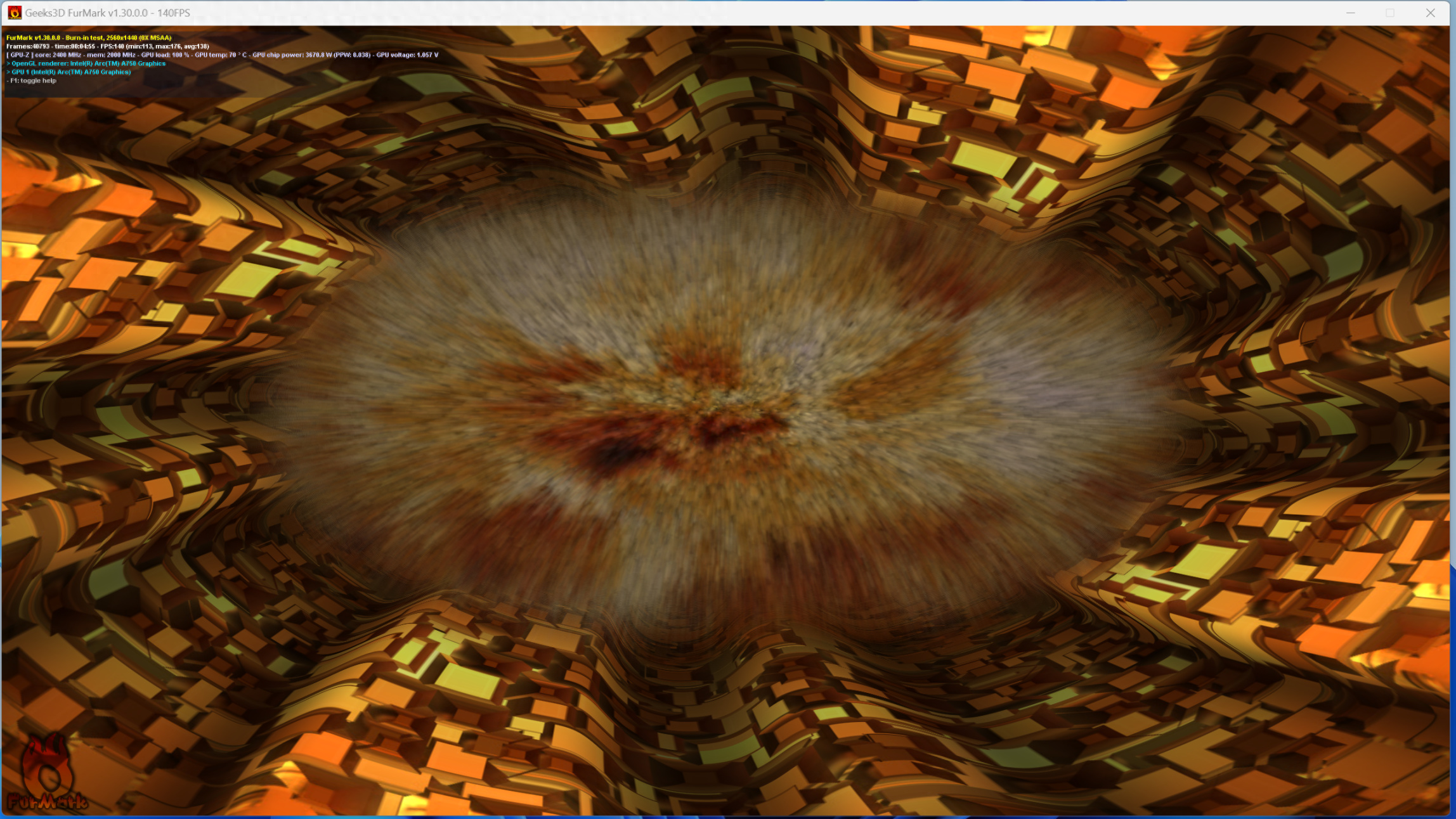然后是蓝戟Intel ARC A750显卡的Furmark烤机情况,室温24℃ ,2K烤机十分钟左右,平均帧为140帧,温度维持在70℃.这个表现已经算是同级显卡中比较优秀的了。