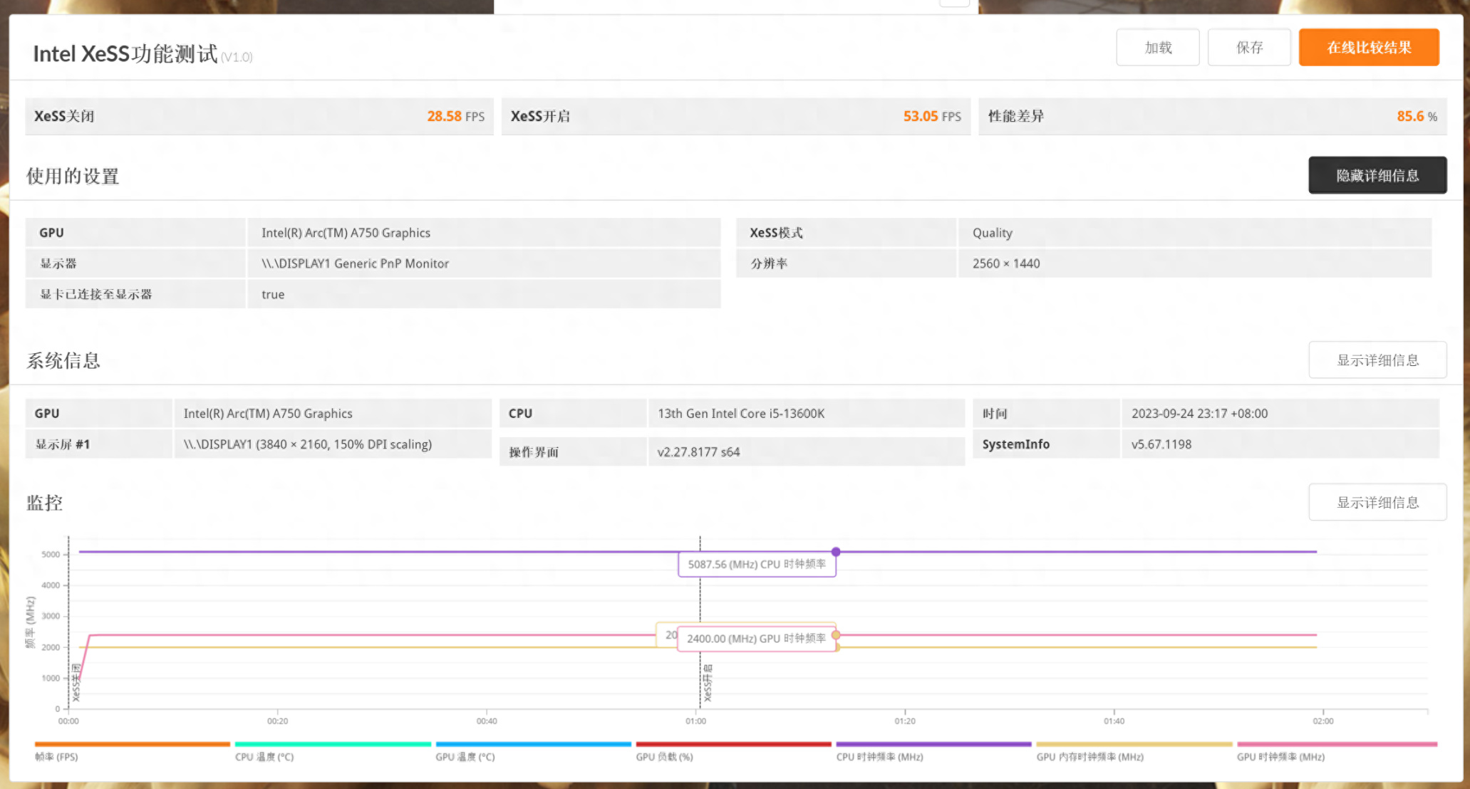 咱们实测使用3Dmark里面的Intel XeSS功能测试:关闭XeSS,帧数为28.63,开启XeSS帧数为53.05帧,性能相差85.6%,性能接近翻倍!!!