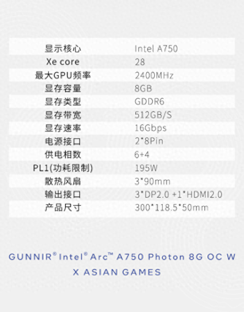A750 Photon 采用了 28 个 Xe 核心,最大频率 2400MHz,显存配备 是来自三星8GB 16Gbps 256bit GDDR6 ,显卡采用台积电 6 纳米工艺ACM-G10 GPU。PL1 功耗为 195W,采用双 8pin电源接口,配备 3 个 DP 2.0 接口和一个 HDMI 2.0 接口。