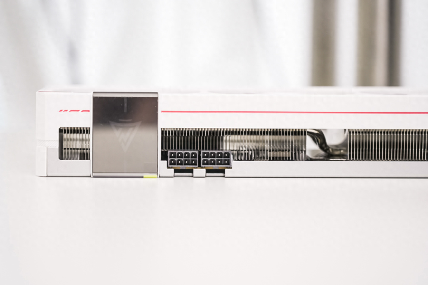 这款显卡供电接口为双8pin设计。显卡输出接口为三个DP 2.0以及一个HDMI 2.0。