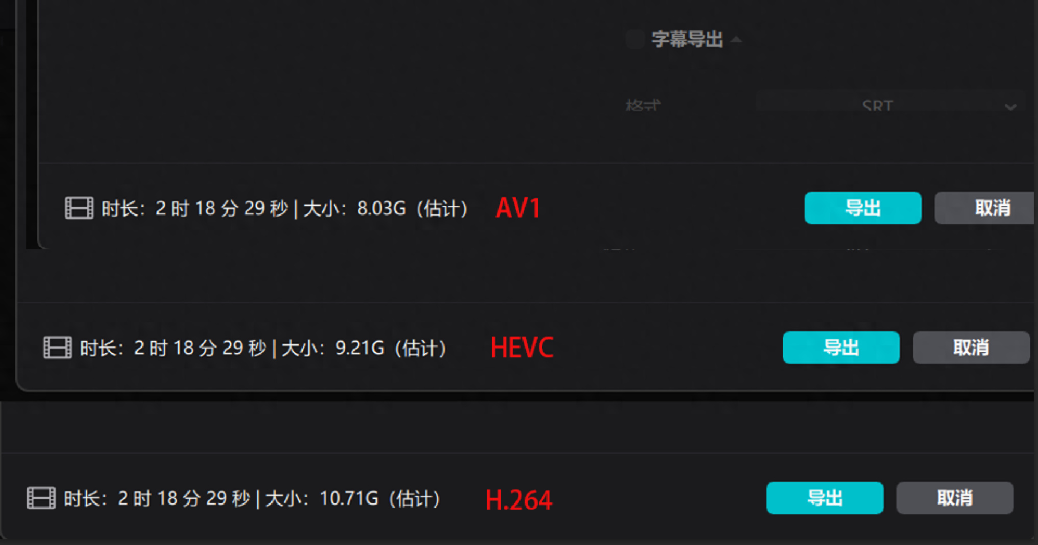 以一个2小时的电影文件测试,分别以H.264,HEVC,AV1导出测试: