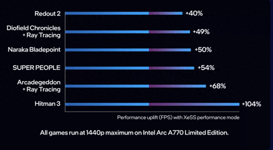 需要说明的是,XeSS 是一种开源标准,可以在许多游戏和广泛的硬件上运行,包括英特尔和其他GPU供应商的产品。XeSS还可以利用Xe GPU的DP4a和XMX硬件功能,以实现更好的性能。XeSS已经得到了多家游戏工作室的合作,将在一系列最新款游戏和游戏引擎中提供。不过 Intel 显卡包含 XMX 内核,可以理解为从硬件层面的支持,其输出质量也是最好的。