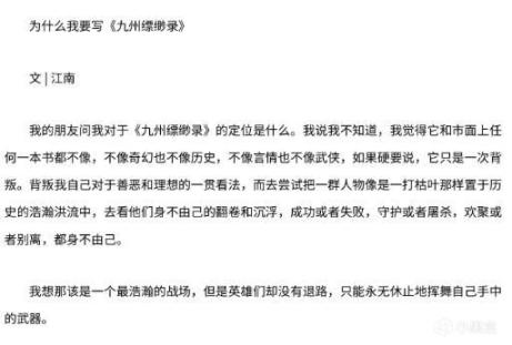 回看最初的江南,从写下《此间的少年》开始,到《九州缥缈录》的诞生,他为这个IP呕心沥血,想要把他打造成完整的世界。为此他拉上写出《悟空传》的今何在等人,搭建出一个“九州”的世界。