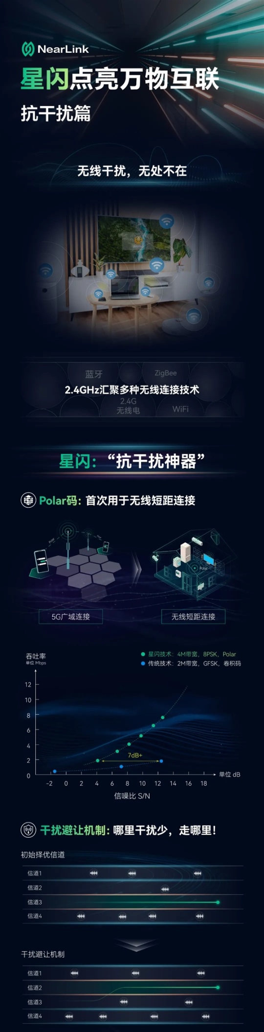 星闪是新一代近距离无线连接技术,首次将5G技术短距化,采用Polar码技术,结合干扰避让机制,抗干扰能力提升7dB(相比传统的短距无线技术)。