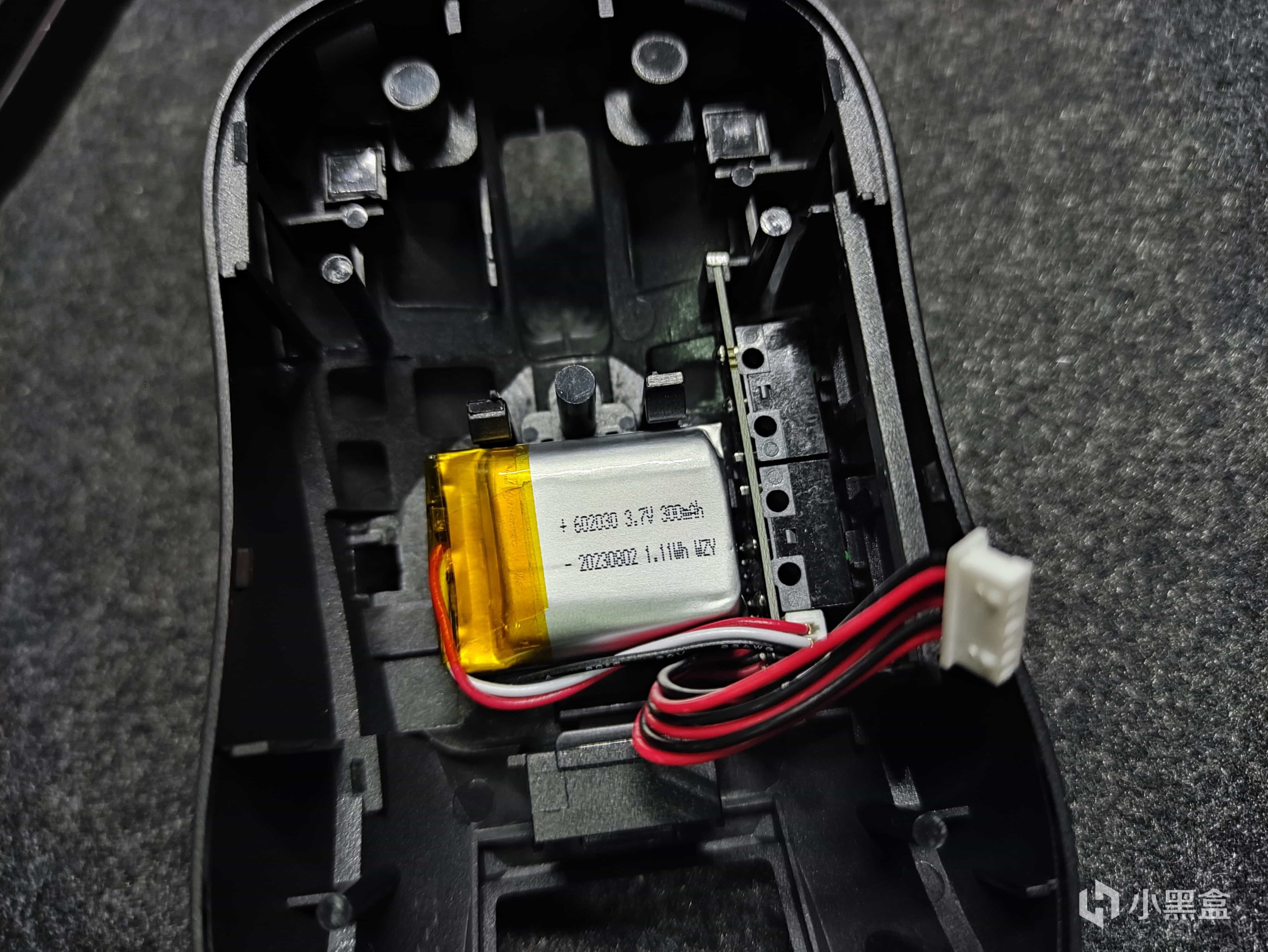 来到鼠标的上半部分,可以看到300mAh的电池。