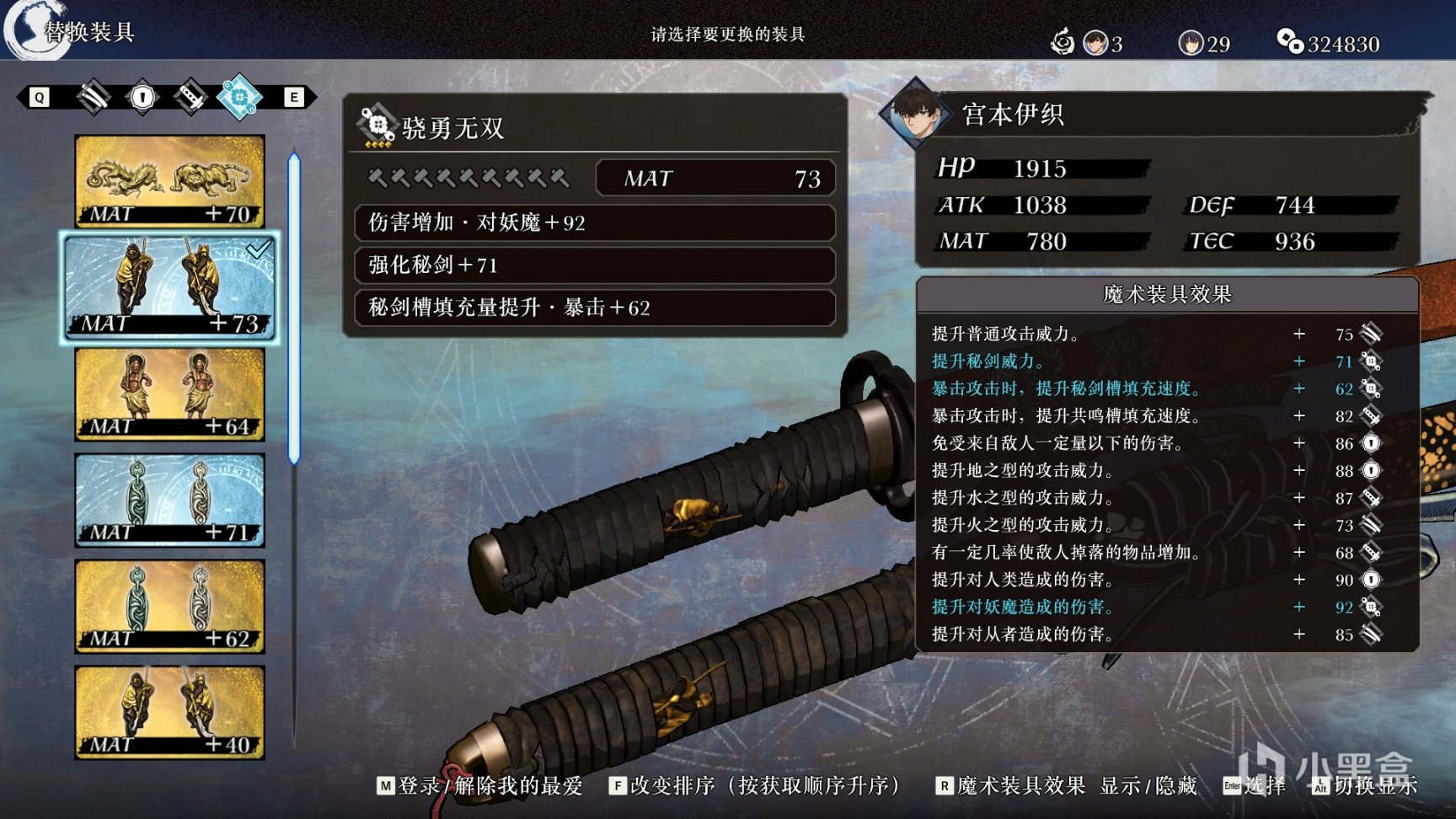 最后,FSR中的装备系统也会提供数值上的提升,除了鞘、镡、柄卷、目贯的主词条会分别影响伊织的ATK(影响物理攻击力)、DEF(影响防御力)、TEC(影响暴击率和回避率以及部分技能发动成功率)和MAT(影响魔术攻击力以及破槽能力)以外,还会随着装备品阶的提升,额外附赠更多的副词条提升,让伊织的极限伤害有了更高的上限。