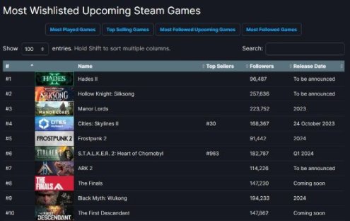 根據SteamDB數據顯示,《黑神話:悟空》在Steam願望單上的排名已經升至第9位了,目前榜單前十名如下: