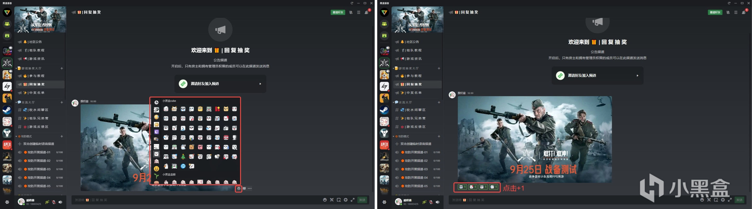 - 在9月28日17:00前往「从军官方社区」的「回复抽奖」频道,对管理员发布的抽奖消息进行表情回应即可参与抽奖活动,抽奖活动持续至10月4日24:00。每位用户最多可获得一个奖品。中奖用户可前往黑盒语音-最近消息-系统消息领取。