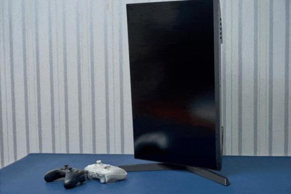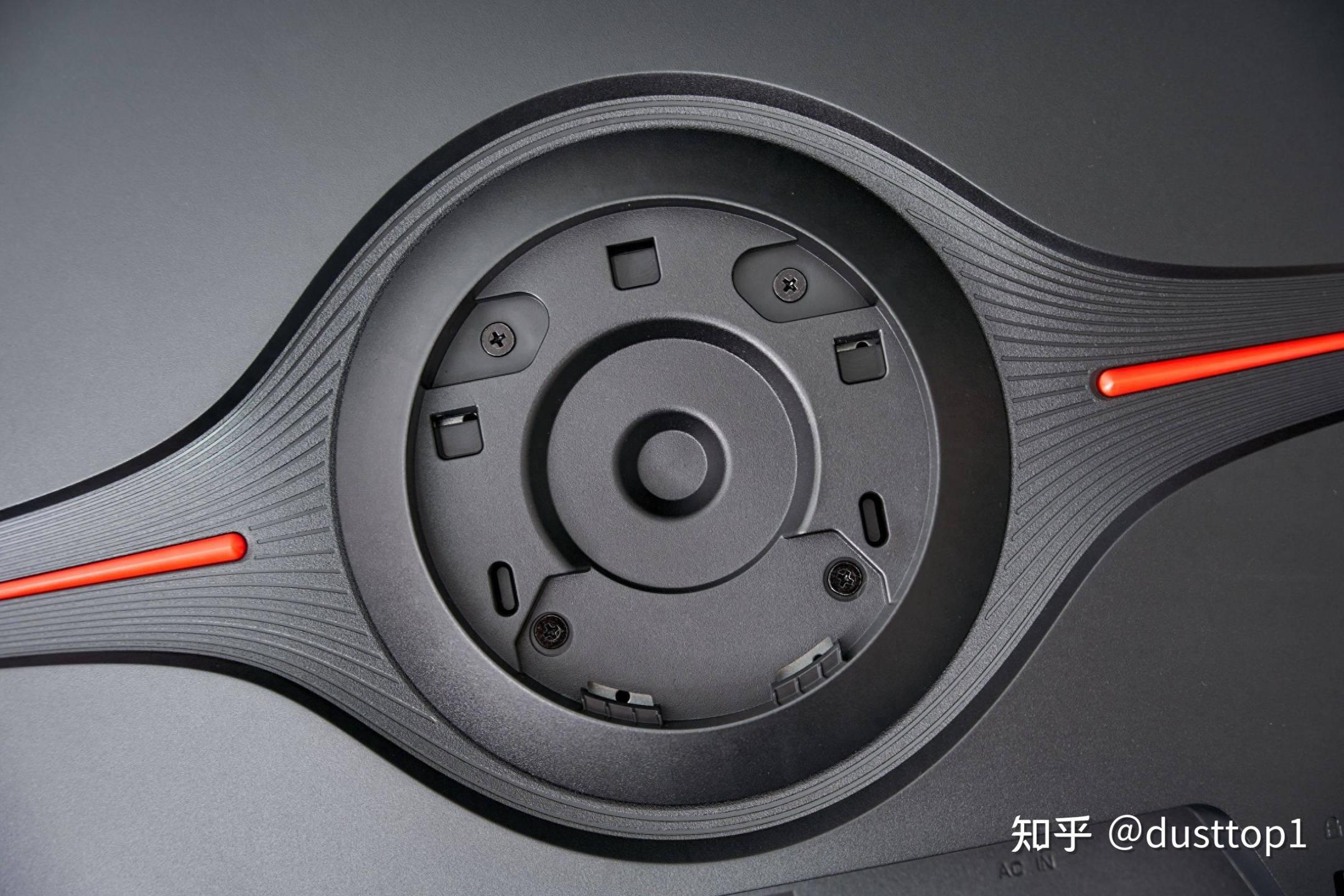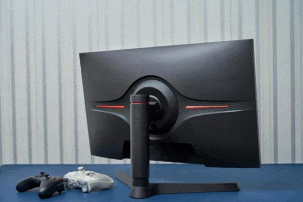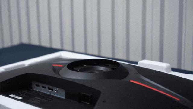 X71QH的背面也保持着简洁硬核的设计风格。支架与屏幕连接处是圆环造型,两边以导流凹槽和红色线条装饰,如同机械眼悬浮在背,进一步强化电竞战斗气息。