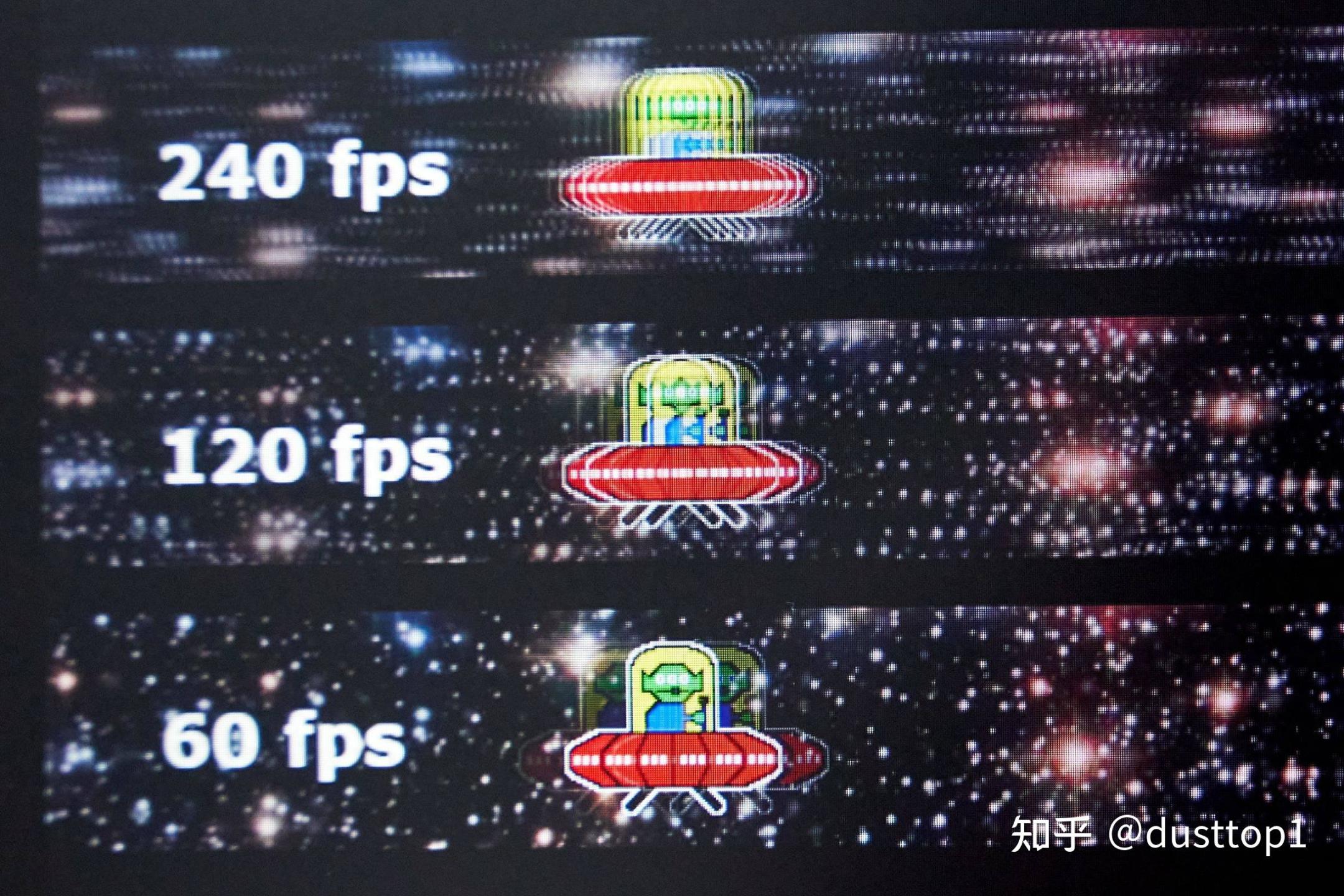 动图不明显,那就用相机怼着屏幕直拍。上图是相机在六十分之一快门下的成像照片。可以看到240fps的轨道内,有最多的UFO图像叠加,这就是高刷的秘密:同等时间下,能够提供更多帧的画面,让眼睛更享流畅丝滑。