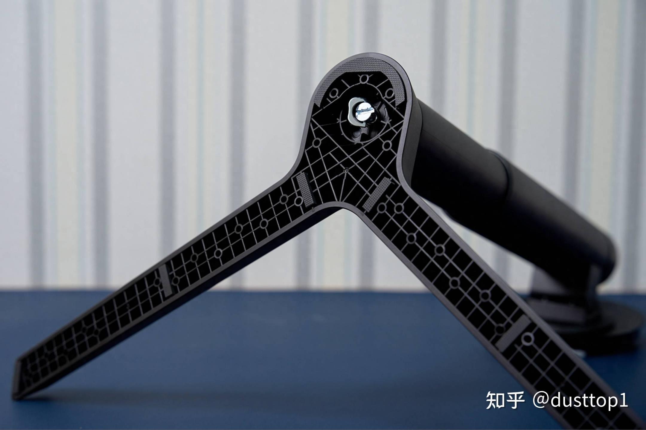 值得一夸的是,X71QH的屏幕支架做了轻量化设计。支架的底座和支杆大量运用了工程塑料,内部密布着如同3D打印的复杂加强筋结构,与桌面接触的部位还有厚实的硅胶减震垫。这都是在保障屏幕放置稳固,也让屏幕的整体重量大幅下降。