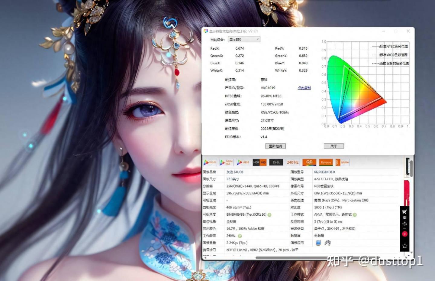 X71QH采用的液晶面板来自友达的FastIPS面板M270DAN08.0,2K分辨率(即2560×1440)。FastIPS继承了IPS的光荣传统,而X71QH可达到100%sRGB、90%DCI-P3的色彩空间覆盖率。