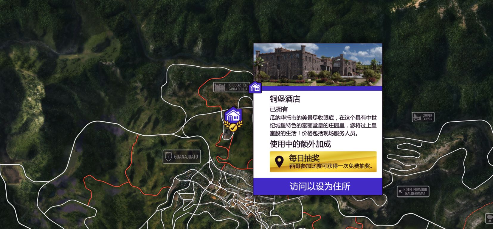 銅堡酒店的位置參考上圖,擁有該房屋後,每日參加比賽均可獲得 1 次免費抽獎。