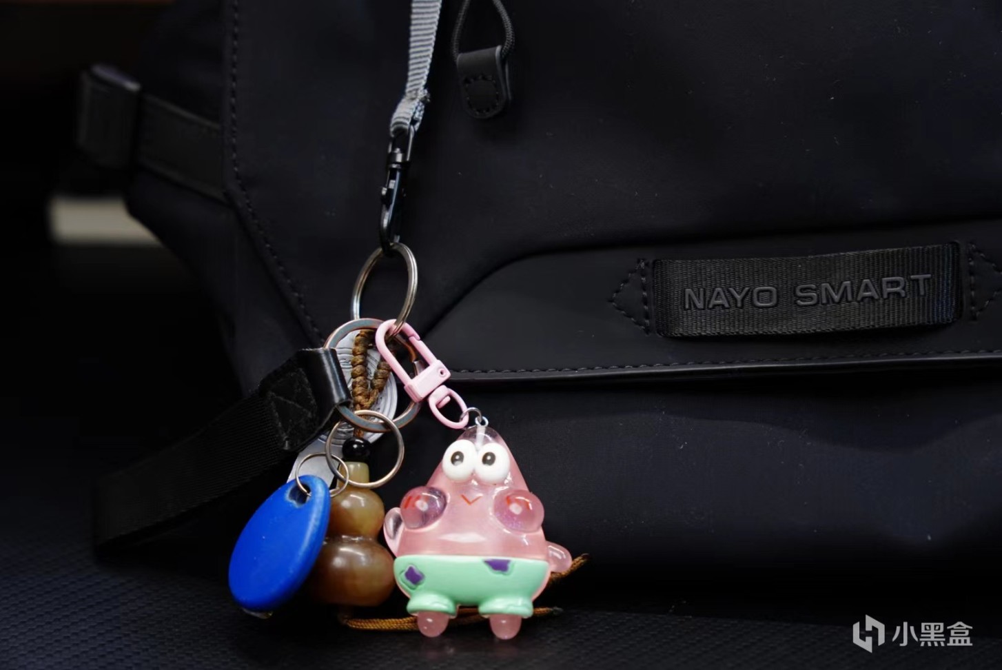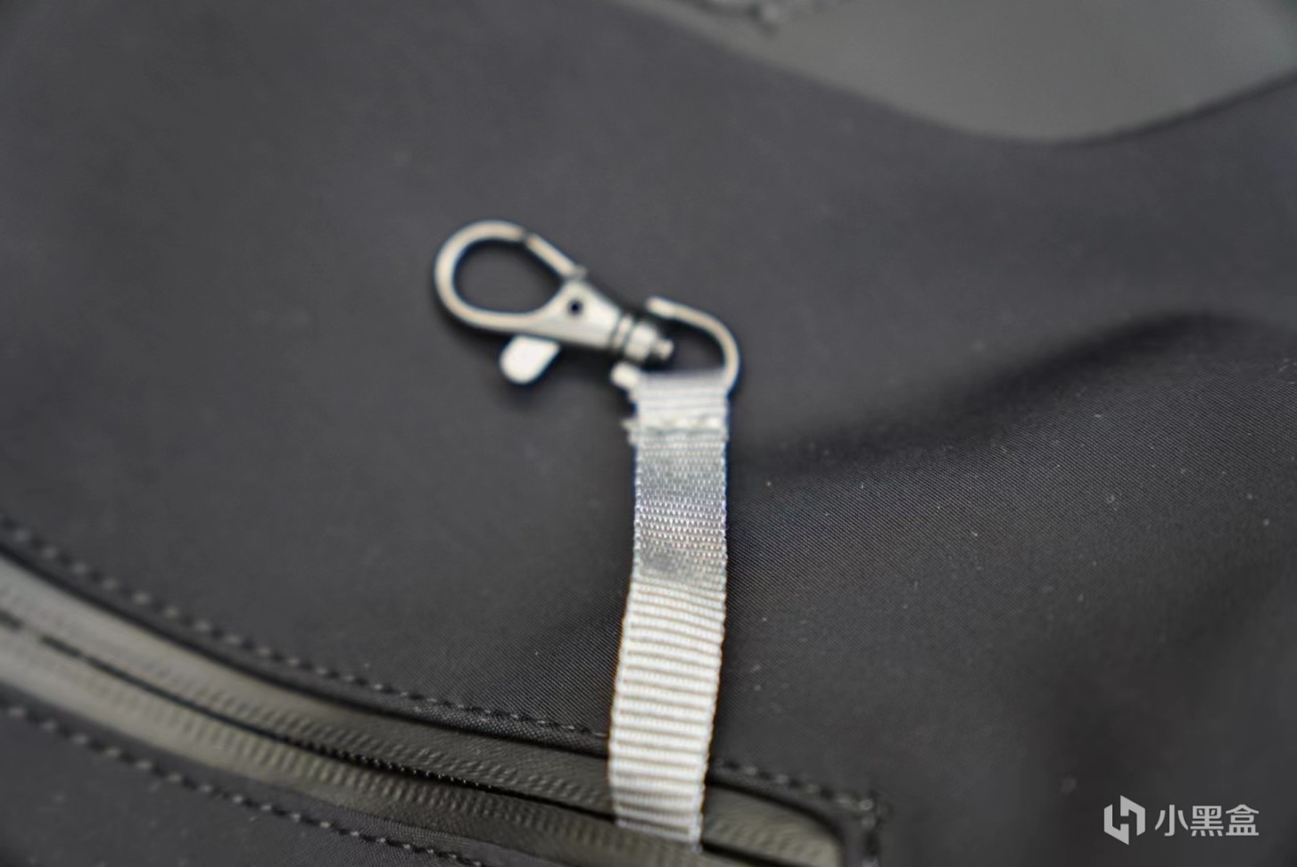 上面的一个口袋里面配备了一个钥匙链,说真不错的,这样我就可以把我家门钥匙直接挂上去,也防止我到家门,翻很久背包就为了找这个钥匙。。。。而且这个钥匙链做了一定的延长的设计,在我实际体验中就是我这个身高用这个包在钥匙不拿下来的情况下,是完全足够我将钥匙插到门里的。