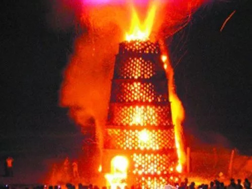 玩花灯还有烧塔,广东广西江西这些地方蛮多的。南方广泛流传着烧瓦子灯(或称烧花塔、烧瓦塔、烧番塔)的游戏。如《中华全国风俗志》卷五记:江西“中秋夜,一般孩子于野外拾瓦片,堆成一圆塔形,有多孔。黄昏时于明月下置木柴塔中烧之。俟瓦片烧红,再泼以煤油,火上加油,霎时四野火红,照耀如昼。直至夜深,无人观看,始行泼息,是名烧瓦子灯”。