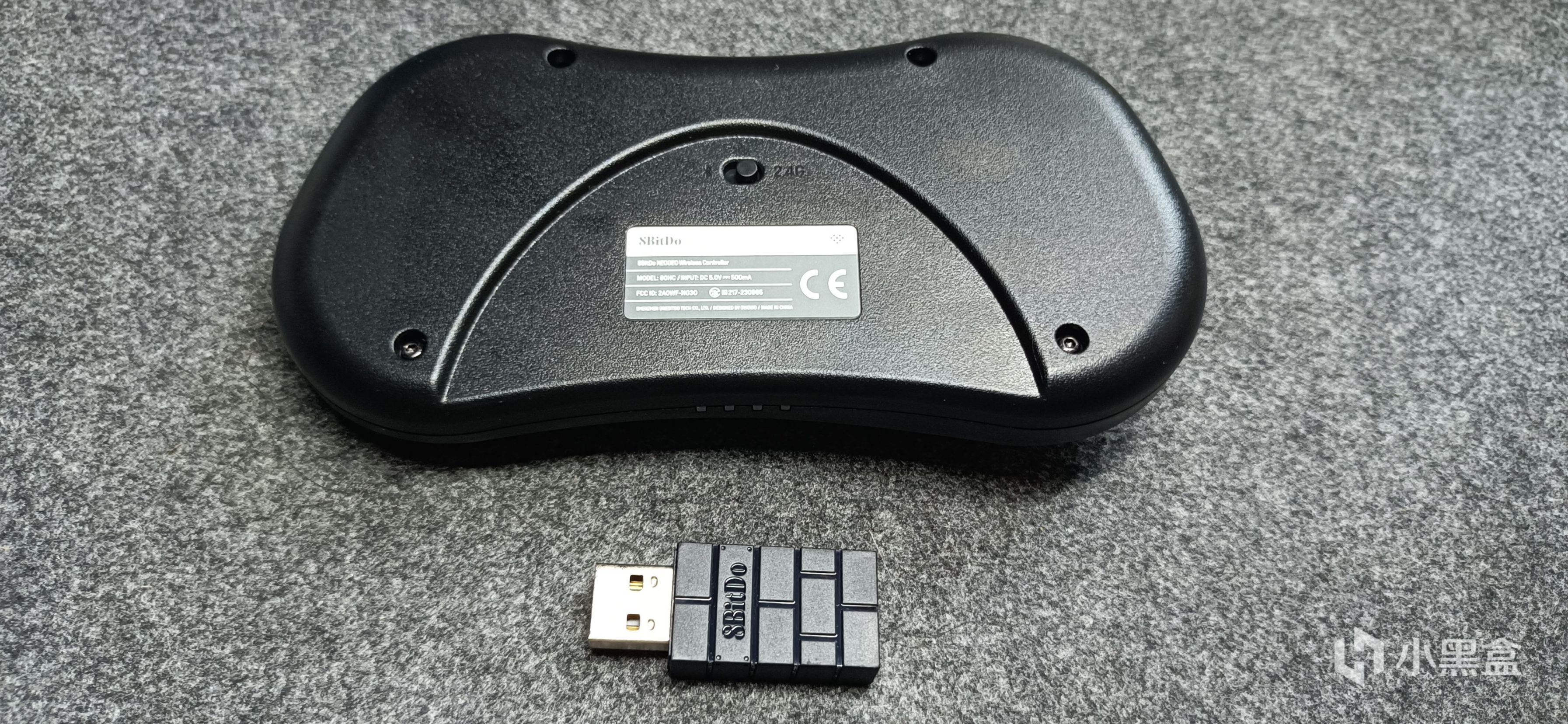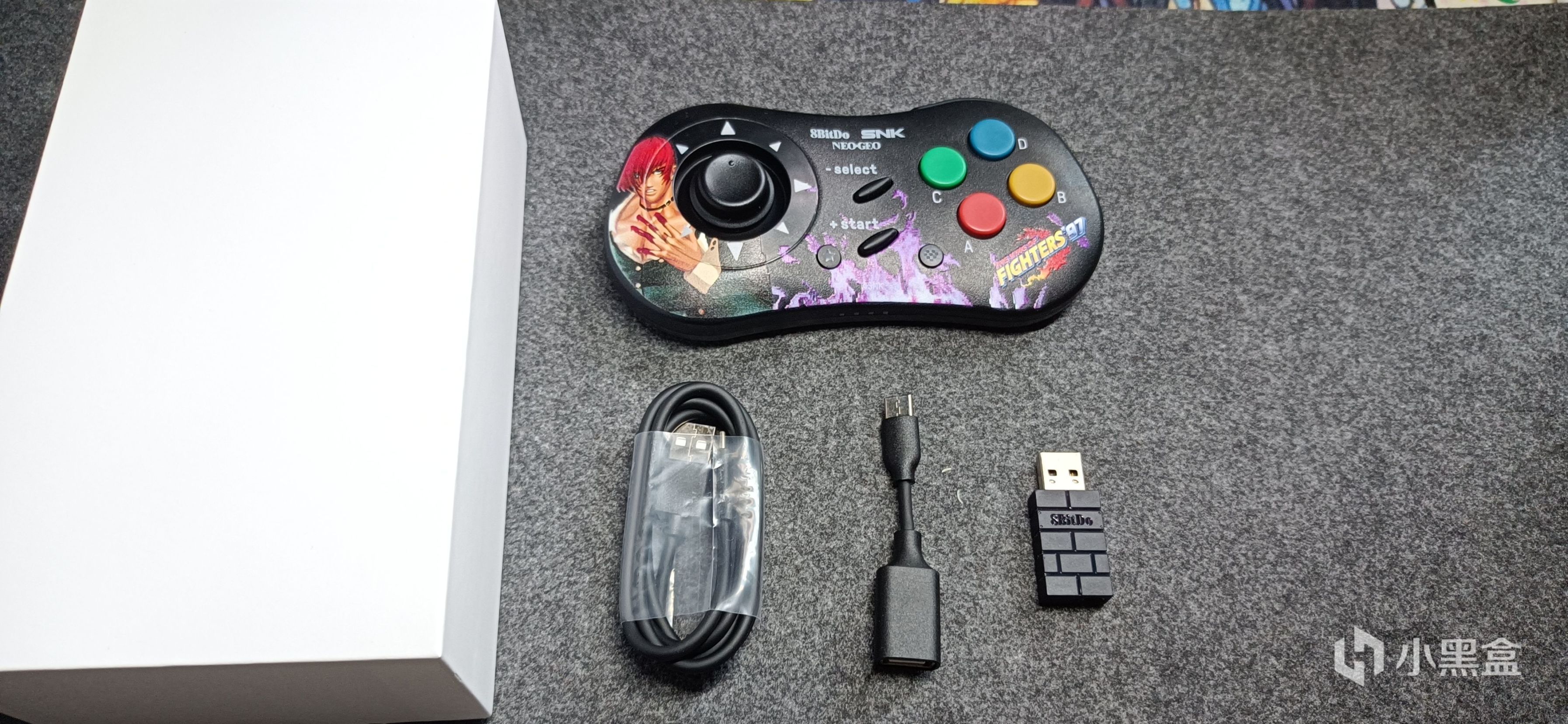打开外包装盒,是一个硬礼盒设计,延续了八位堂一惯的简约作风。随手柄附赠的有,一条typec转换线,一个接收器,一个长数据线。接收器依旧延续了八位堂比较复古的小方块设计。
