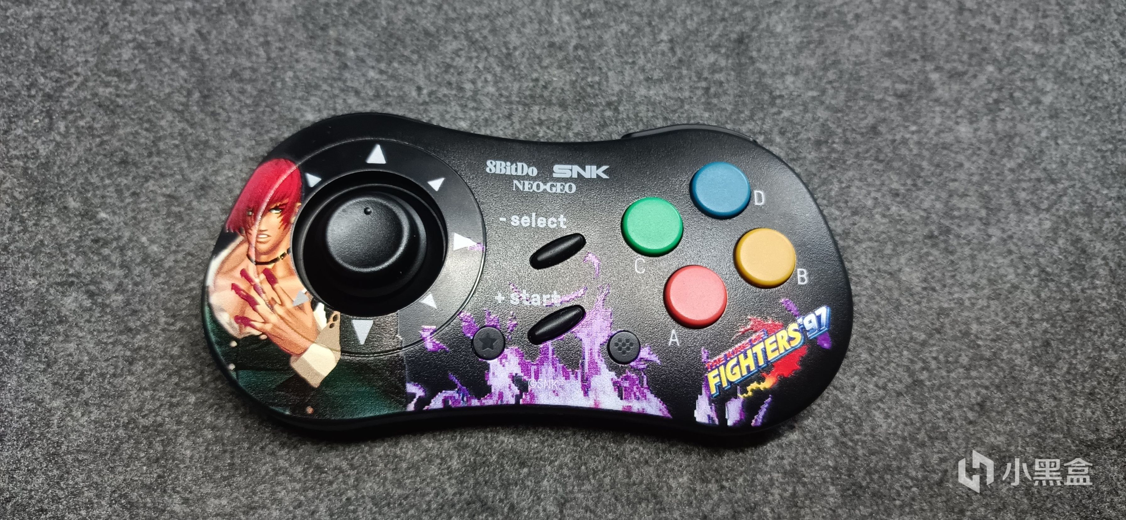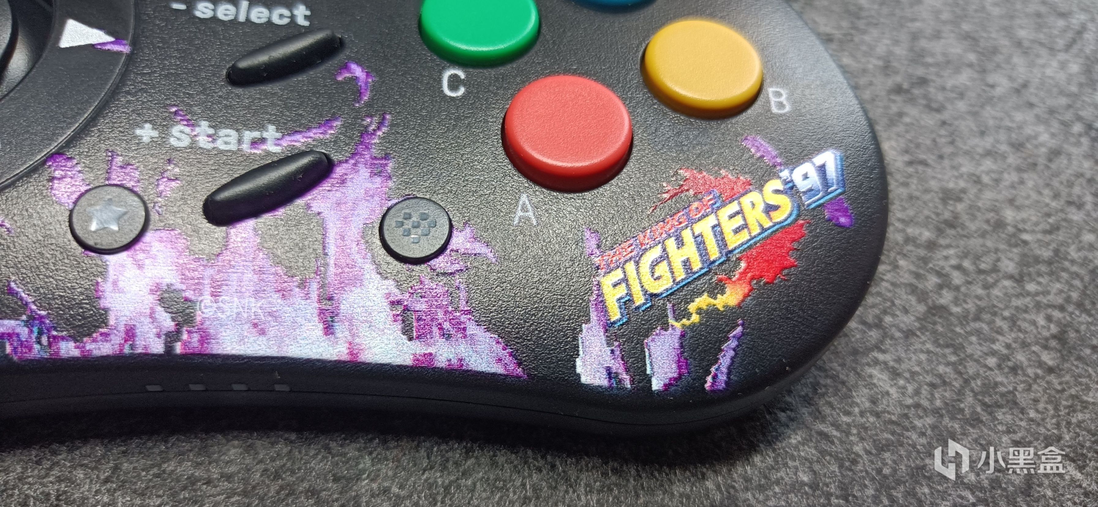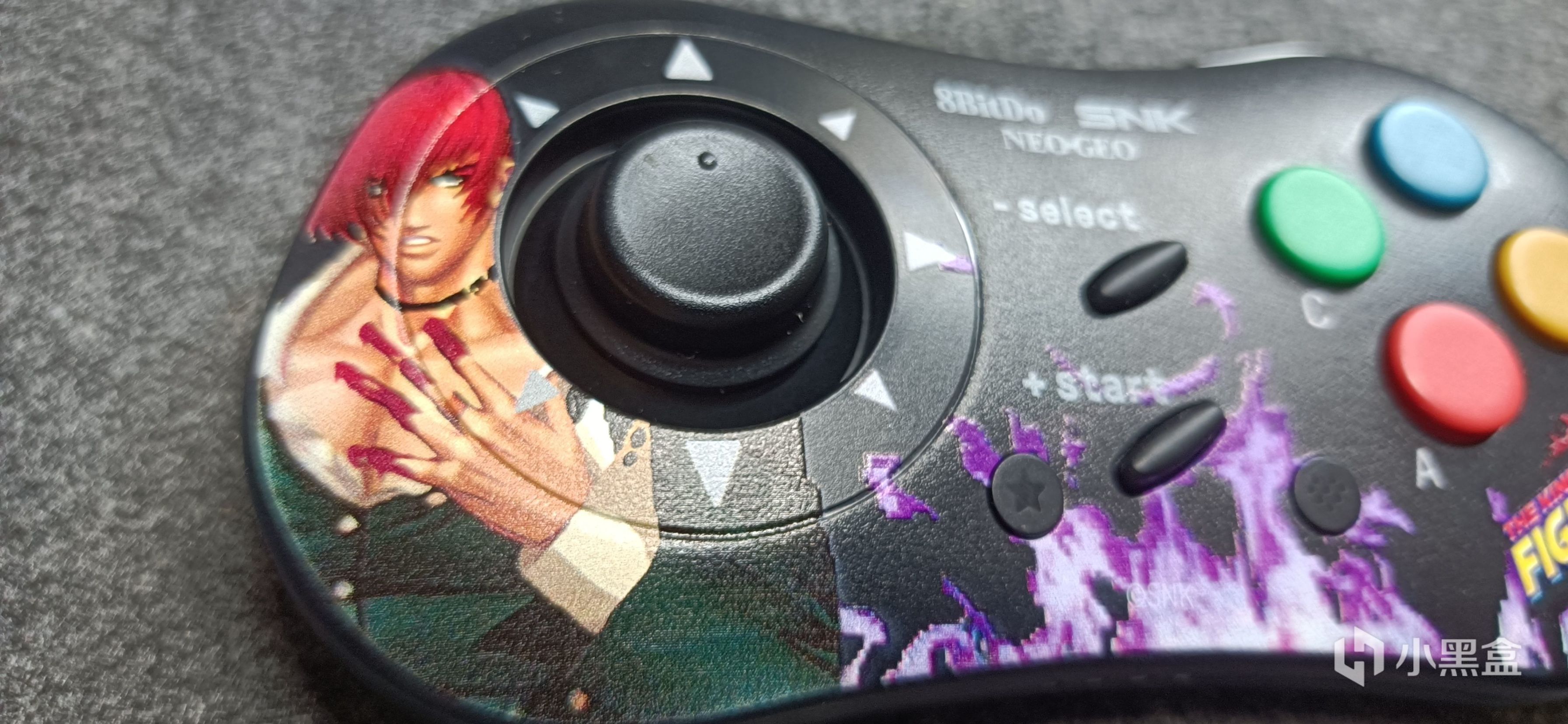 手柄颜值是我最满意的一点,不同于一般手柄的粗糙贴图,八位堂NEOGEO手柄图案仿佛是刻在上面一样,精致耐用而又美观霸气。手柄左面是我们拳王届yyds——八神庵,狂妄不羁的表情让我很上头哈哈。中间便是拳王标志性的火焰,火焰做了个立体小设计,图案会更加突出,特别是反光的情况下火焰彷佛要喷出来一样。最右边就是拳王97的游戏logo,死去的记忆开始猛烈攻击我了。