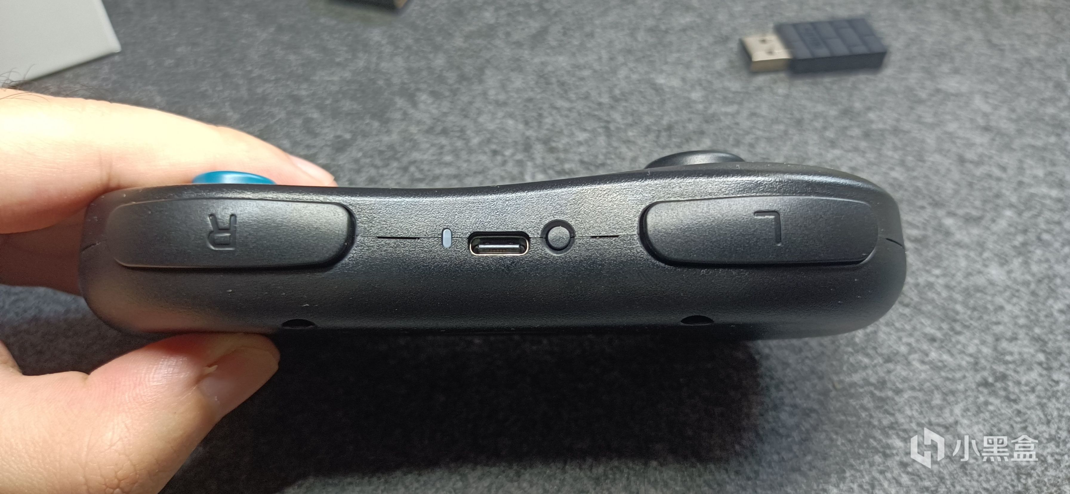 手柄上方没有扳机键,不过有两个很长很宽的肩键。肩键是流线形状,比较符合食指的人体关节弯曲情况,很适合把食指贴上去。