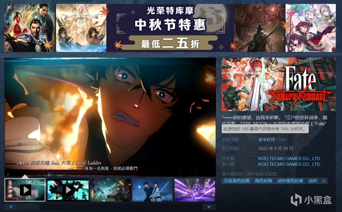 光荣的全新作品《Fate/Samurai Remnant》已经发售。目前,游戏在Steam平台上的评价多半积极,189条评论中有74%的评价为好评。