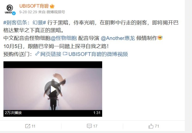 如图所示,育碧官方微博发文宣称:此次中文配音由知名配音导演惠龙负责制作!