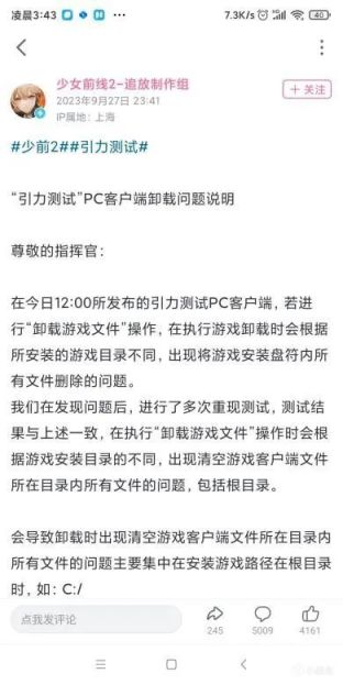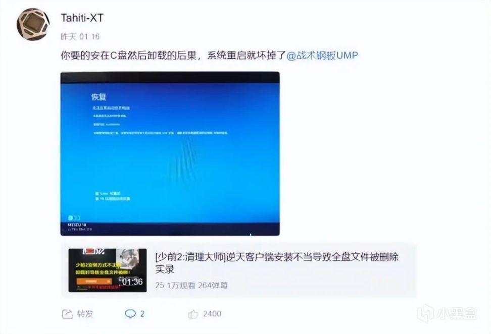 可沒過多久,自己邊等卸載邊玩的塔科夫竟然報錯了。切回桌面的老哥發現,少前2的無敵卸載程序竟然把E盤所存儲的300G的文件直接和遊戲文件一塊兒給卸載乾淨了。因爲是卸載這種“高級”操作,所以回收站裏當然是連一根毛都沒有啦。氣的老哥直接上網控訴!