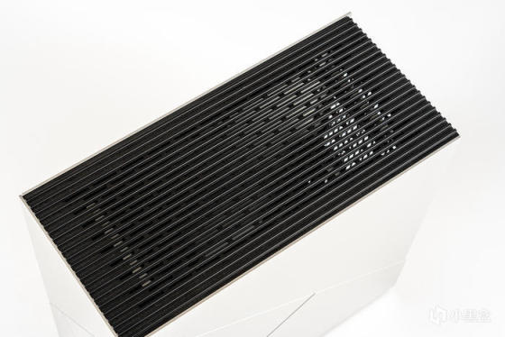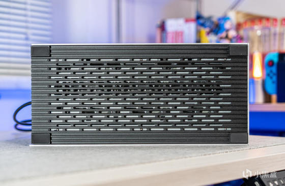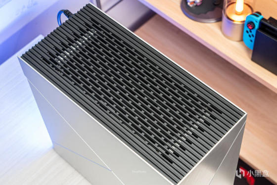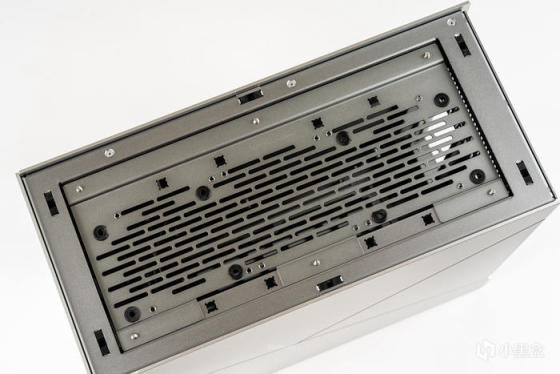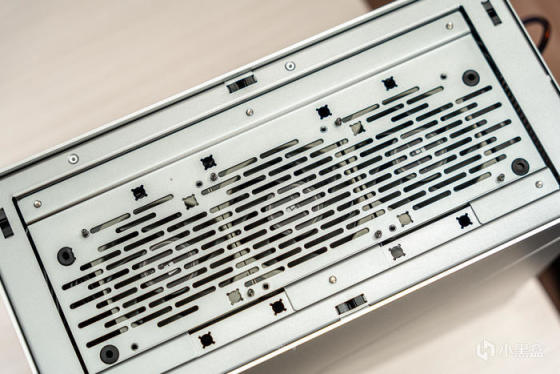 虽然整机银色机身,但是顶板和底板都是黑色阳极氧化铝,为最高规格5mm厚度,且做了条形的开槽进行散热优化;底板与顶板是一样的5mm铝板开槽散热优化设计,只是底板增加了四个角的橡胶脚垫设计