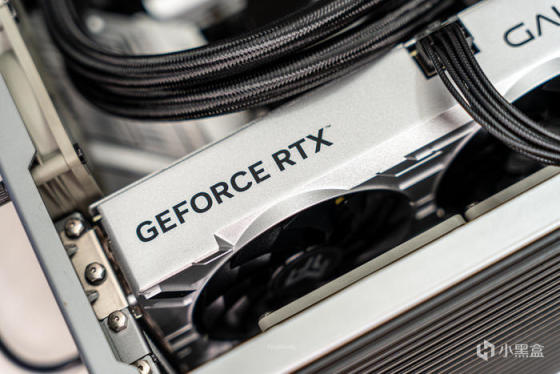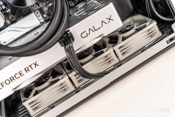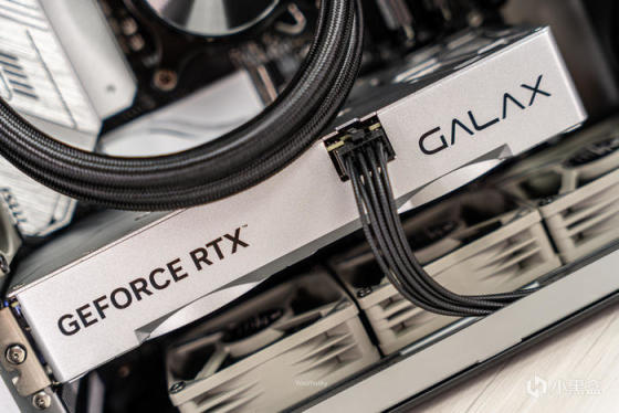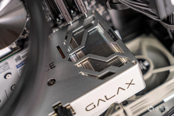 显卡的顶部为封闭式设计,只露出了一个单8P显卡接口,顶部只有GEFORCE RTX和GALAX两个LOGO,采用CNC高光两边、金属拉丝、雾面等多种工艺打造